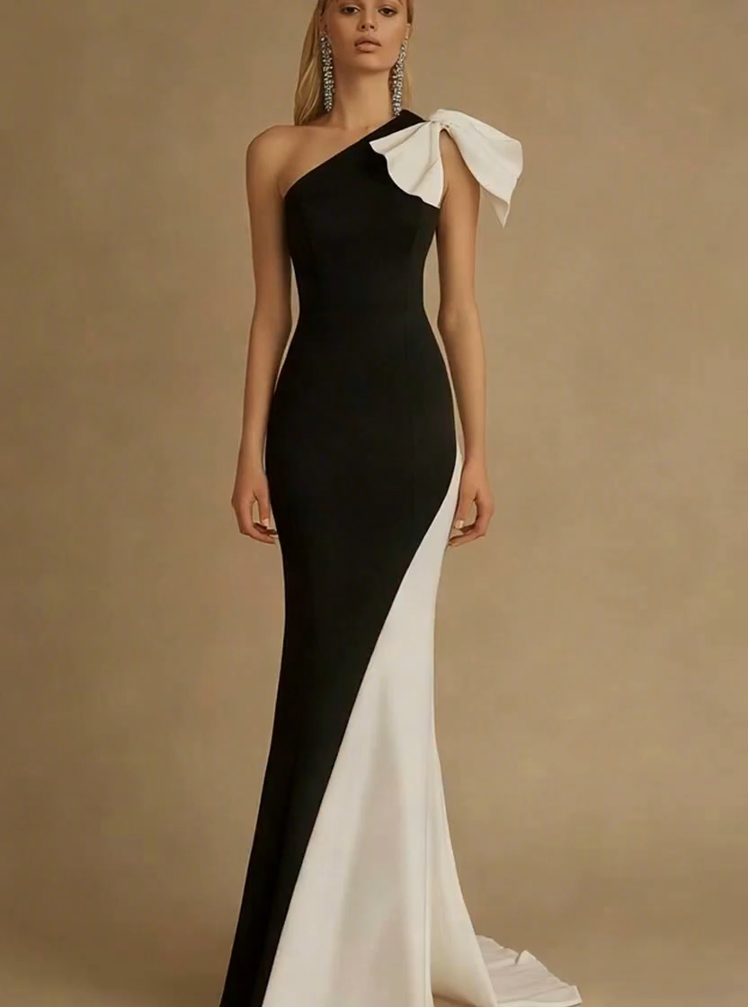 Black and White Satin Mermaid Maxi Evening Dress with Bow