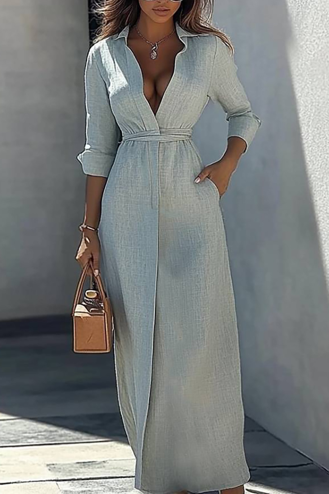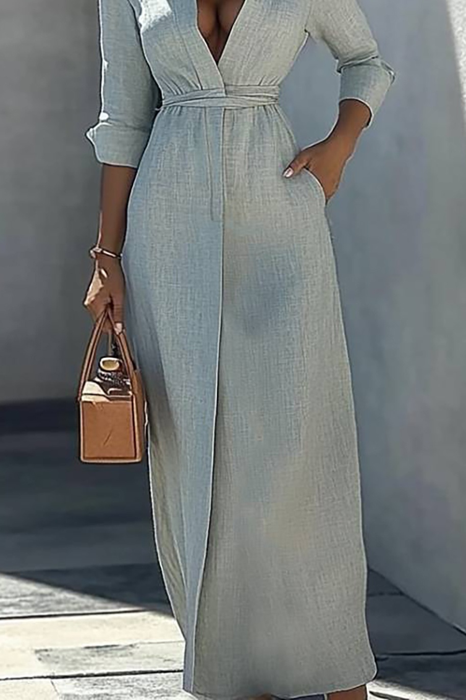Vacation Casual Linen Dress Light Blue Long Sleeve Pocket Maxi Dress