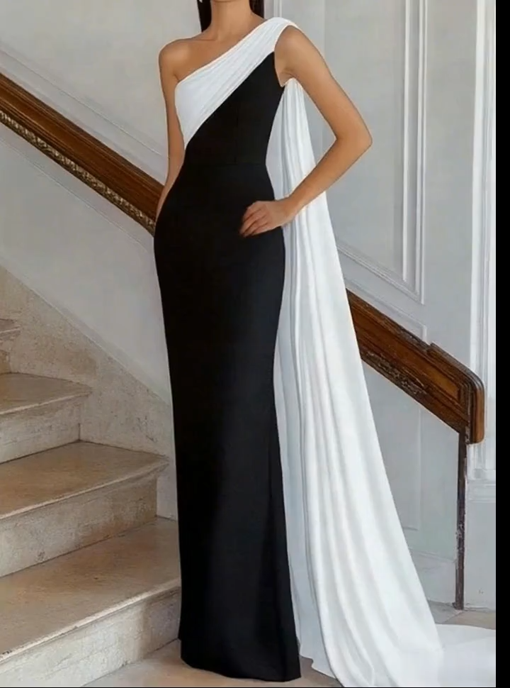 This black and white formal dress showcases a striking blend of elegance and modern design. The sleek sheath silhouette gently hugs the figure, creating a sophisticated and elongated look. Its one-shoulder neckline adds an asymmetric charm, perfectly complemented by a flowing side cape that drapes gracefully for added drama and movement. The contrasting black and white palette enhances the contemporary style, making it ideal for galas, evening parties, or formal events. Designed for women who love minimalistic yet statement-making fashion, this dress offers both comfort and a timelessly chic presence for any memorable occasion.