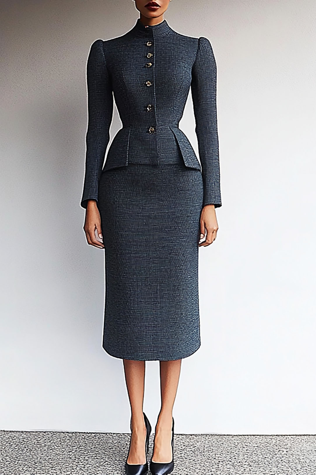 This gray tweed work suit set exudes refined elegance with its stand collar, long sleeve jacket, and coordinating midi skirt. Designed for the modern professional, it blends classic tailoring with contemporary style. The premium tweed fabric offers texture and durability, while the midi skirt ensures comfort and mobility. Ideal for office days, client meetings, and formal business events, this set can be worn together for a polished look or styled separately for versatile outfits.