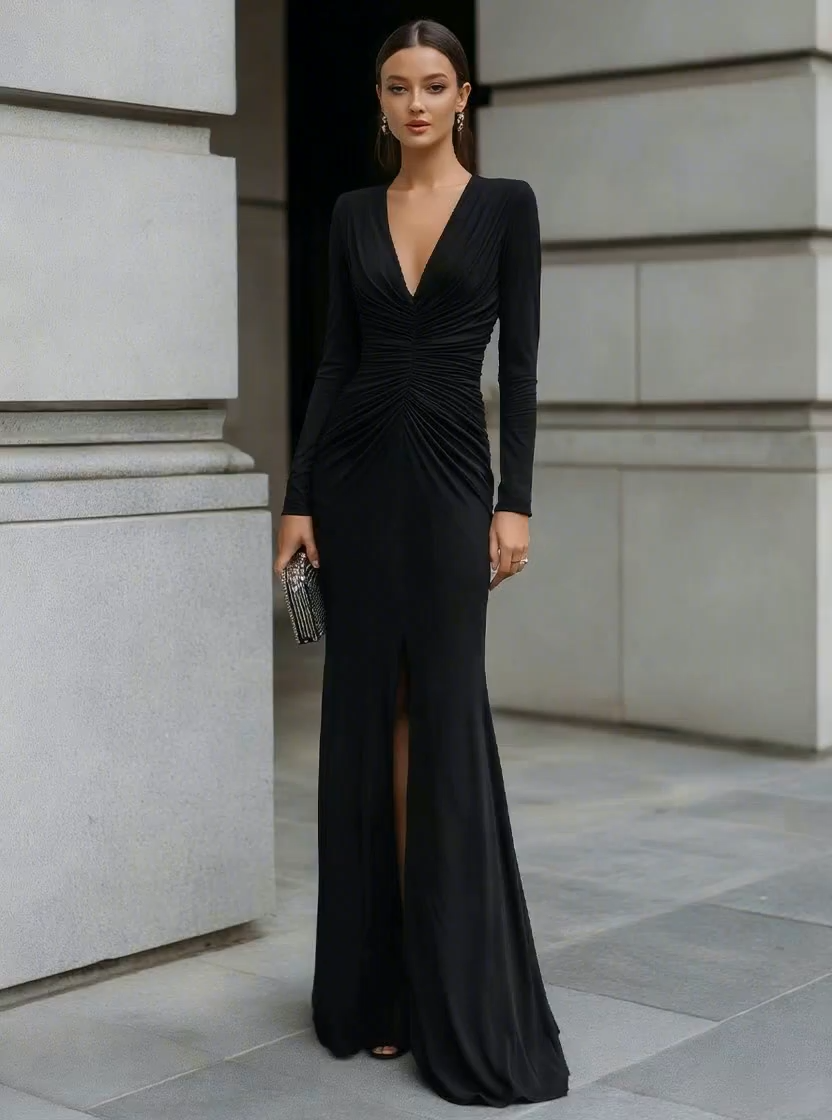 Allurelily presents an elegant column gown designed to embody refined sensuality and sculptural sophistication. This striking silhouette features a plunging V-neckline that elongates the neckline and enhances feminine confidence, balanced by long fitted sleeves for a polished and composed finish. The bodice is artfully ruched from the waist through the hips, creating dynamic texture while contouring the figure with precision. A subtle front slit adds movement and allure, allowing the gown to flow gracefully with every step.