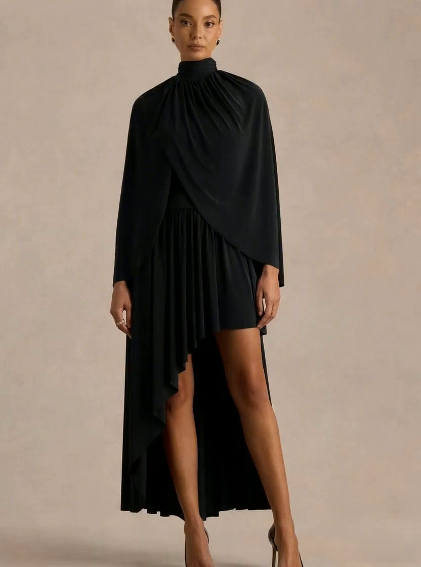 Crafted from our premium stretch jersey in a rich black hue, this midi-length design flows effortlessly with every movement. The high neckline and cape sleeves create a graceful, refined silhouette, while the draped detailing and drop waist sculpt the figure with subtle drama. Honora is the perfect choice for statement occasions that call for timeless style.