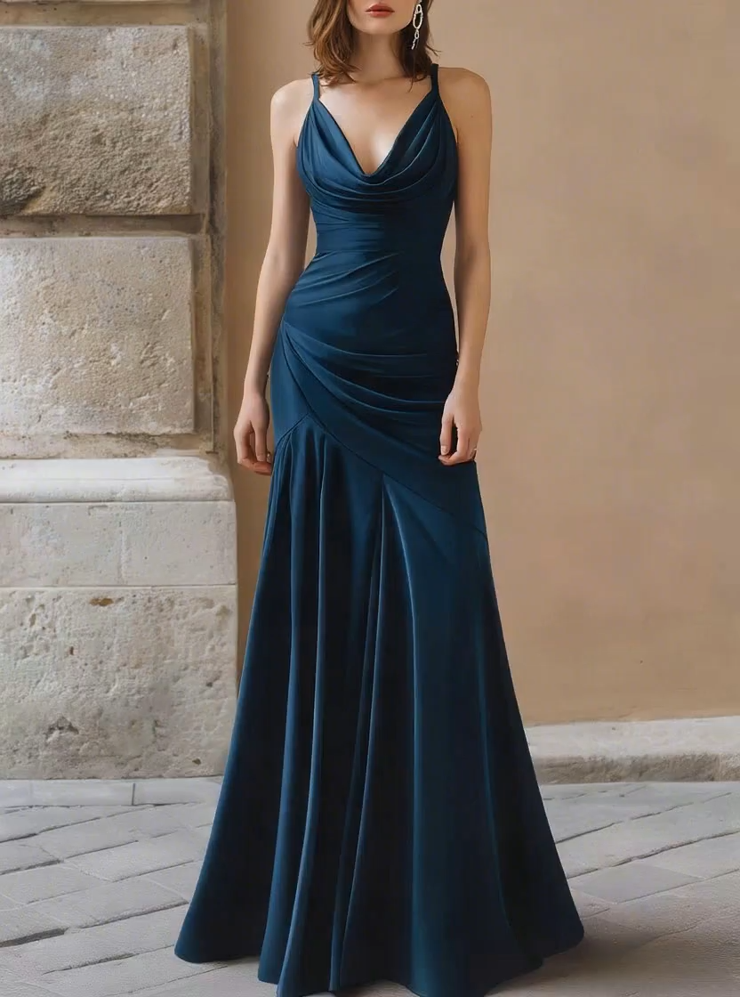 This elegant maxi dress is designed to embody timeless sophistication through fluid draping and refined tailoring. Featuring a softly draped cowl neckline, the design gently frames the décolletage while creating a graceful, elongated upper silhouette. Slim shoulder straps balance delicacy with support, allowing the neckline to remain the focal point without overwhelming the overall look.