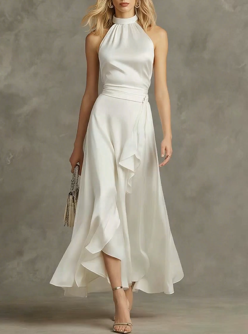 2.Design: Sleeveless, halter neck design, ruffles.