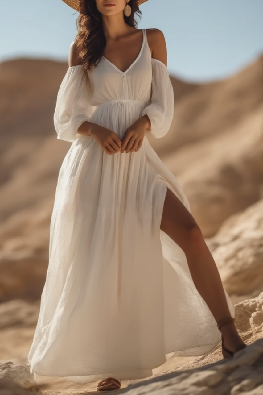 Bohemian Swing Dress White V Neck Slit Maxi Dress