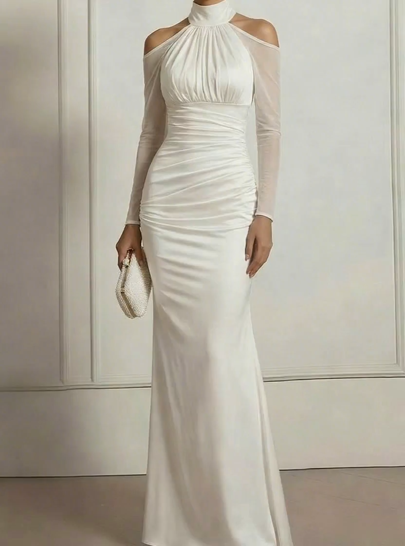 This elegant dress is crafted from chiffon fabric in white, perfect for formal events or formal celebrations. The cold shoulder neckline and long sleeve design add a modern touch.Delicate ruched embellishments create dimension and movement.Ideal for evening party, wedding guest attire, or formal wedding, this long dress guarantees effortless glamour.