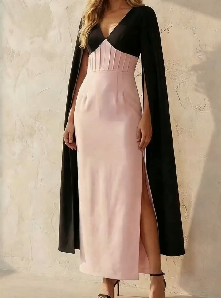 Black and Pink V-Neck Sheath Long Corset Work Dress with Slit