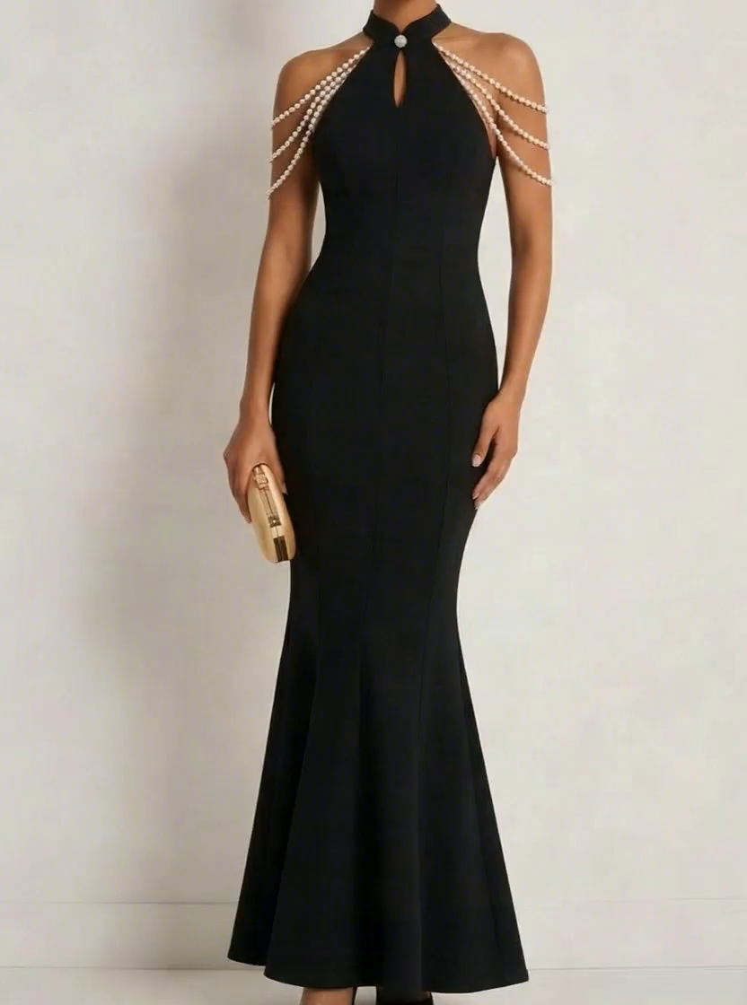 This elegant dress is crafted from polyester fabric in black, perfect for formal events or formal celebrations. The halter neckline and sleeveless design add a modern touch.Delicate beading embellishments create dimension and movement.Ideal for evening party, wedding guest attire, or formal wedding, this long dress guarantees effortless glamour.