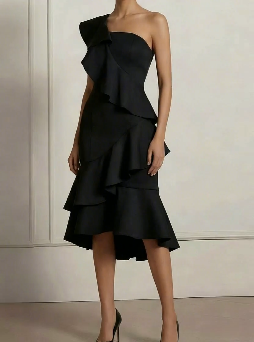 This elegant dress is crafted from chiffon fabric in black, perfect for formal events or formal celebrations. The one shoulder neckline and sleeveless design add a modern touch.Delicate tiered embellishments create dimension and movement.Ideal for evening party, wedding guest attire, or formal wedding, this midi dress guarantees effortless glamour.