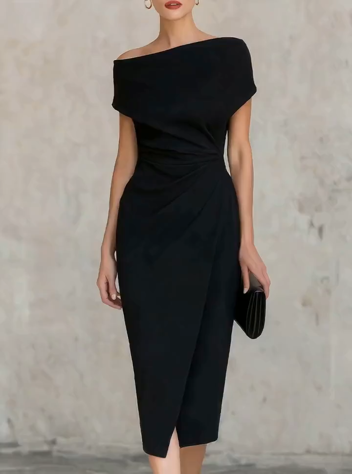 Designed for the modern woman who embraces understated luxury and effortless sophistication, this dress redefines minimalist elegance with a striking asymmetric silhouette. It features a dramatic one-shoulder neckline, a tailored wrap-style twist at the waist, and a sleek midi-length hem with an asymmetric cut, all in a timeless black hue that exudes uncompromising refinement.