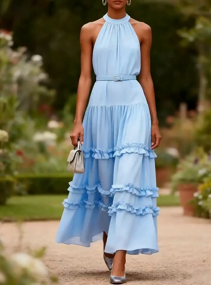 Blue Ruffled Chiffon Halter Sleeveless A-Line Maxi Dress