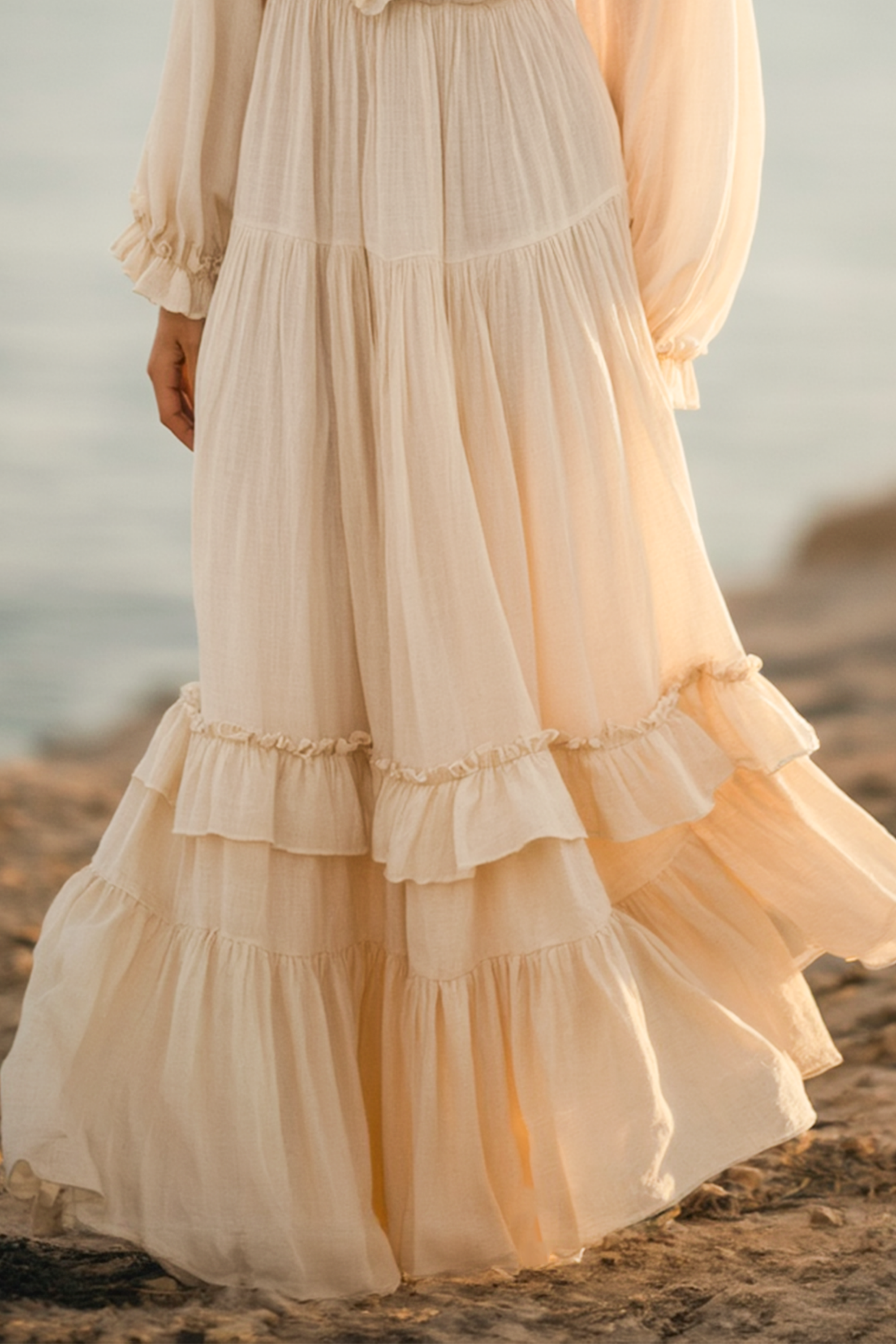 Channel effortless boho elegance in this dreamy beige floor-length dress, featuring a flattering deep V-neckline and cascading ruffle details. The airy, lightweight fabric flows with every step, creating romantic movement perfect for beach weddings or summer soirées. Earthy tones and artisanal textures evoke a free-spirited charm, beautifully complemented by layered jewelry and strappy sandals.