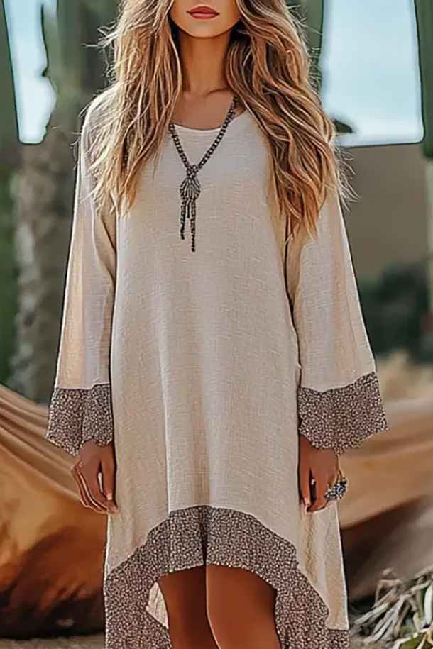 Bohemian Linen Dress Beige Trim Crew Neck Knee-Length Dress