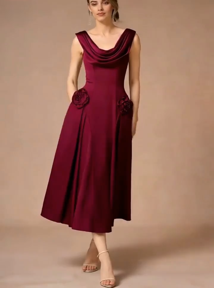 Burgundy Draped Neckline 3D Flower Sleeveless Satin Midi Dress