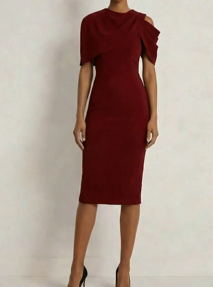 Burgundy Formal Evening Dress Bodycon Asymmetrical Neck Chiffon Midi Dress