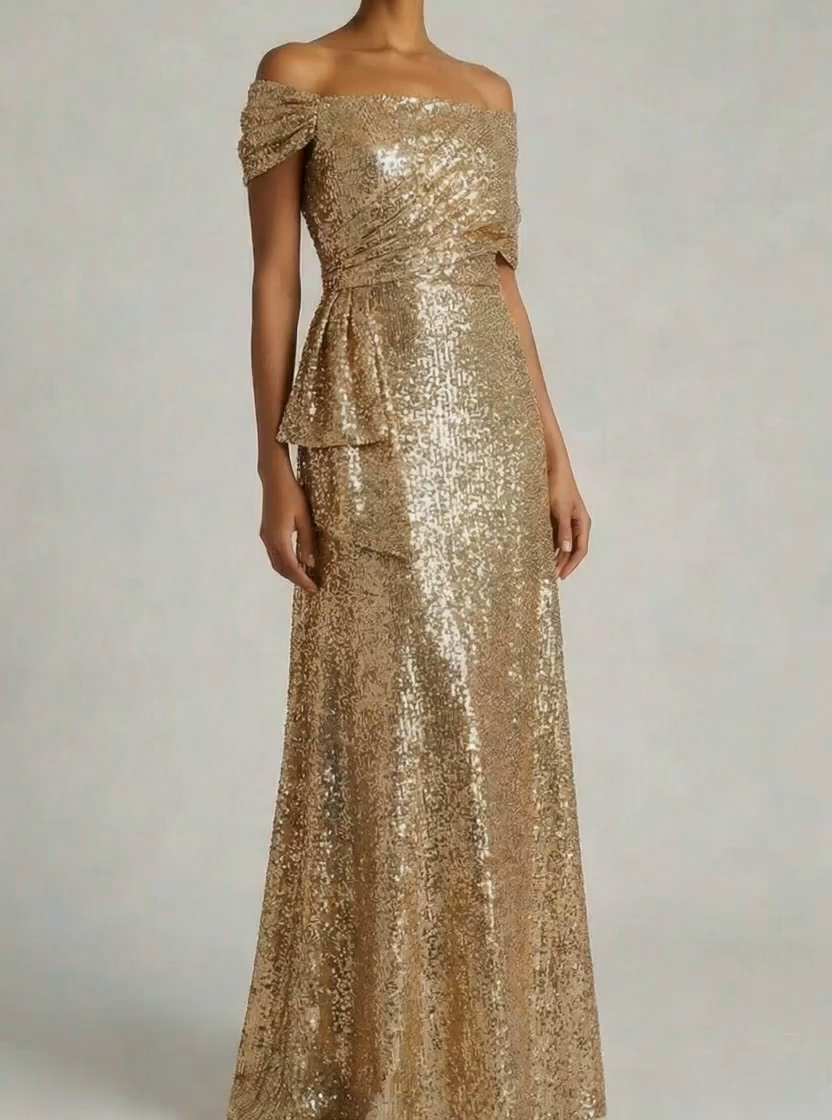 Champagne Formal Party Dress A-Line Off the Shoulder Sequin Maxi Dress