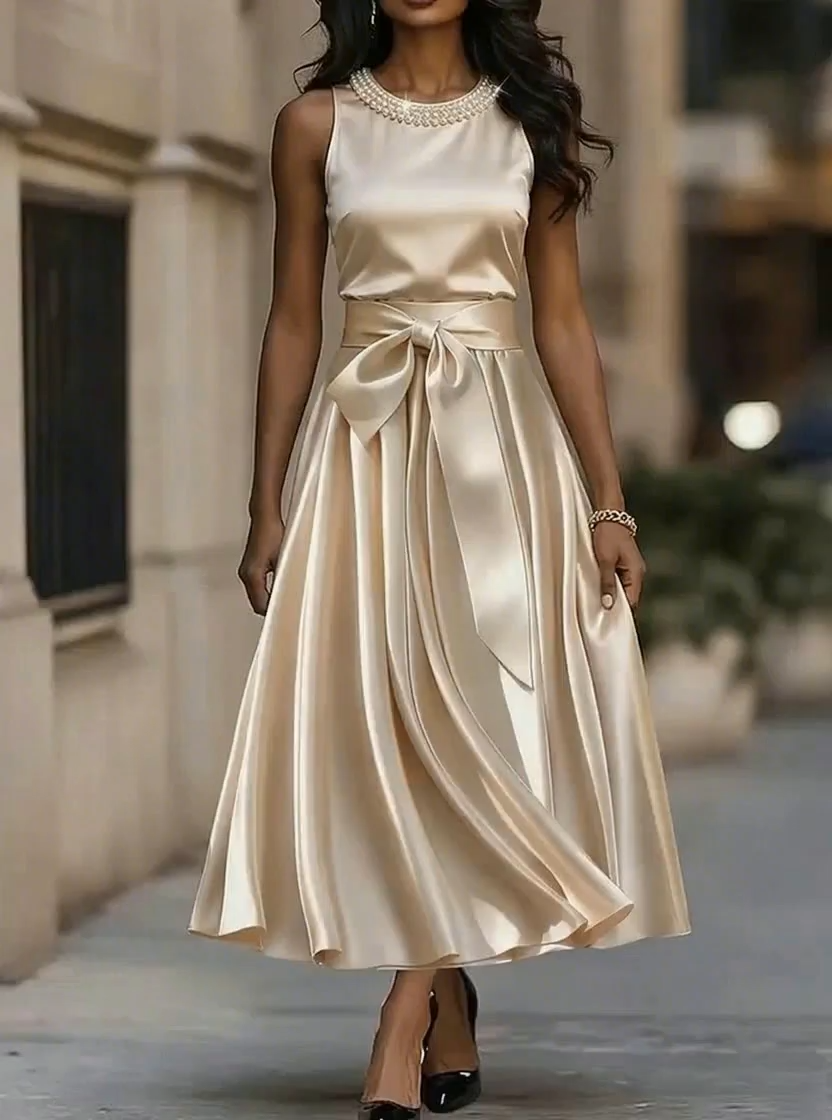 • A champagne satin midi gown with a pearl-embellished neckline and bow waist, evoking the timeless sophistication of old-Hollywood red-carpet style and modern formal elegance.