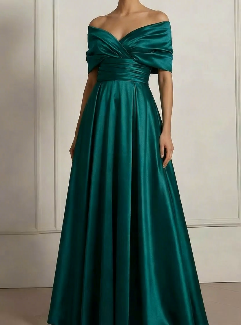 This elegant dress is crafted from satin fabric in emerald green, perfect for formal events or formal celebrations. The off shoulder neckline and sleeveless design add a modern touch.Delicate ruched embellishments create dimension and movement.Ideal for evening party, wedding guest attire, or formal wedding, this long dress guarantees effortless glamour.