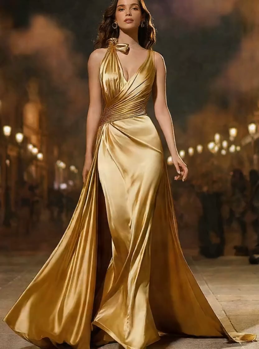 Gold Satin Mermaid V-Neck Maxi Formal Dress with Cape