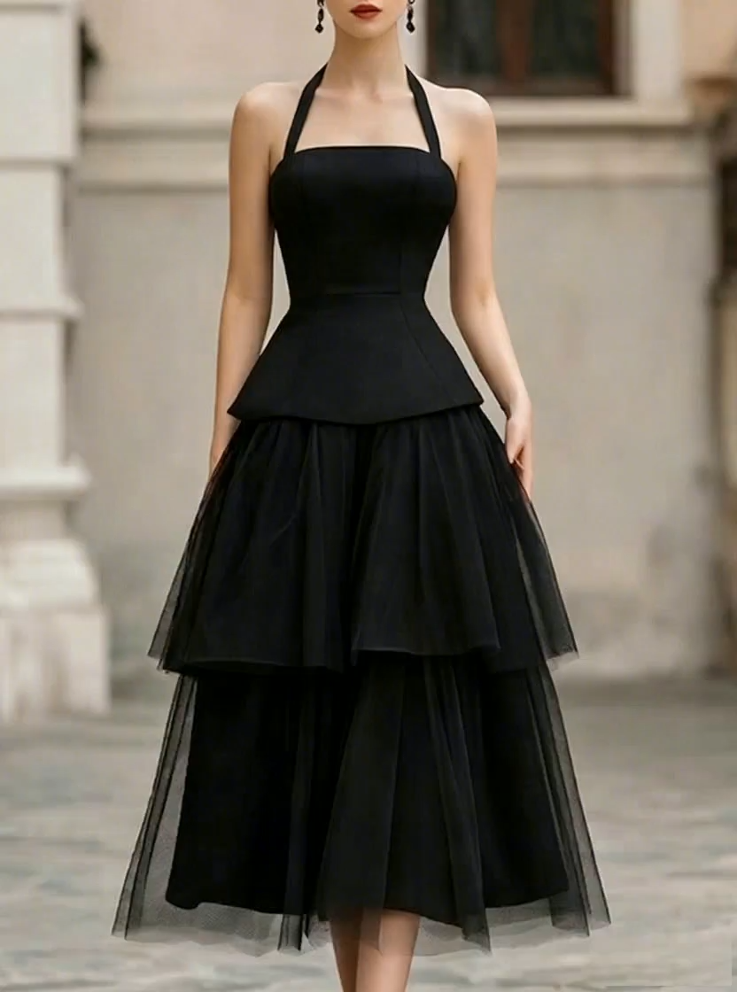 This striking midi dress combines architectural tailoring with soft, romantic layering to create a refined yet statement-making silhouette. Designed with a halter neckline, the upper bodice elegantly frames the shoulders and neckline, offering a clean and modern profile. The structured bodice is expertly contoured to shape the waist, delivering a flattering and sculpted fit that enhances natural curves.