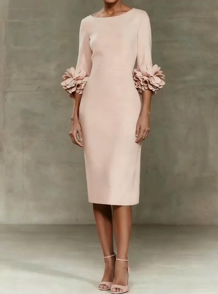 Light Pink 3D Floral Classic Crew Neck Half Sleeve Sheath Midi Dress
