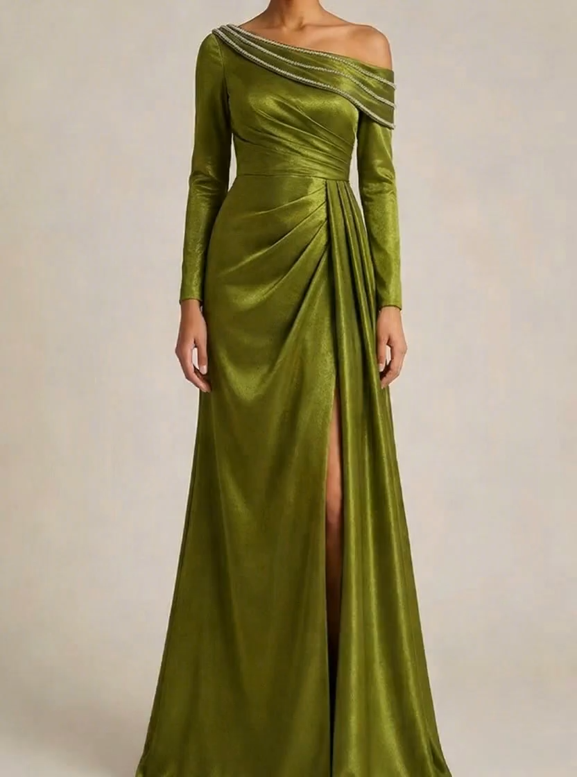This elegant dress is crafted from satin fabric in mustard green, perfect for formal events or formal celebrations. The one shoulder neckline and long sleeve design add a modern touch.Delicate slit embellishments create dimension and movement.Ideal for evening party, wedding guest attire, or formal wedding, this long dress guarantees effortless glamour.