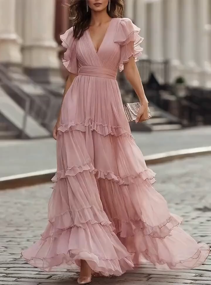 • Lightweight chiffon and a fitted cut balance style and comfort. The fitted waist of this pink chiffon ruffled gown flatters the figure, while the chiffon fabric is both flowing and breathable. The flowing skirt minimizes any sense of restriction, exuding the relaxed romance of a 90s Parisian garden wedding. The fabric is suitable for spring, summer, and autumn; the short sleeves and flowing skirt create a flattering silhouette while maintaining a romantic feel, ensuring comfort for both weddings and social occasions. The gentle pink color combined with the flowing chiffon adds a touch of sophistication, balancing romance and elegance.
