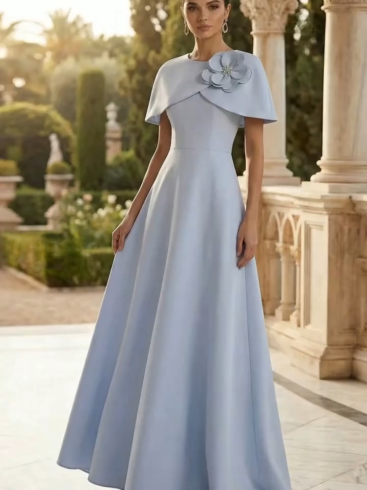 Sky Blue Formal Dress A-Line Round Neck Maxi Dress with Cape