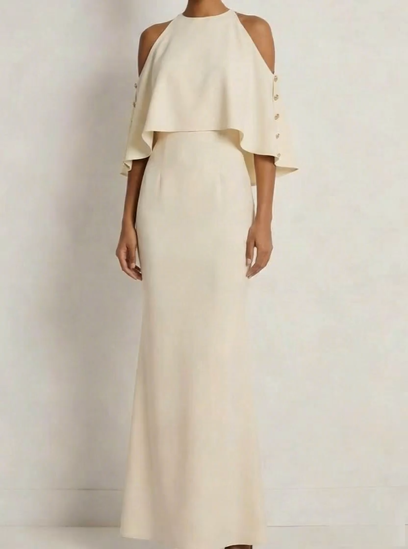 This elegant dress is crafted from chiffon fabric in white, perfect for formal events or formal celebrations. The cold shoulder and sleeveless design add a modern touch.Delicate cape embellishments create dimension and movement.Ideal for evening party, wedding guest attire, or formal wedding, this long dress guarantees effortless glamour.