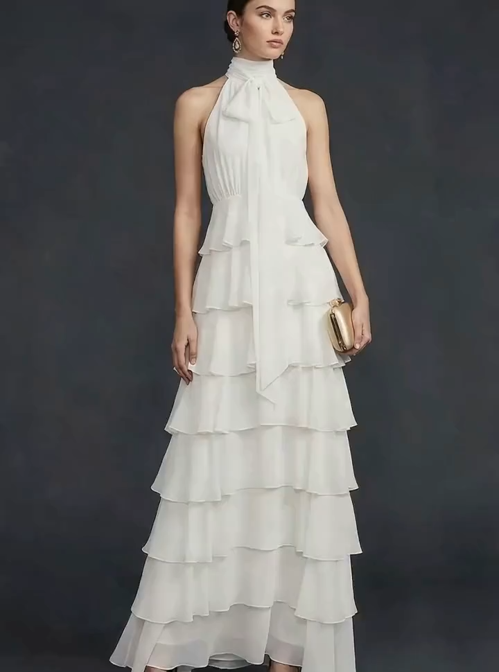 White High Neck Ruffled A Line Maxi Wedding Reception Dress